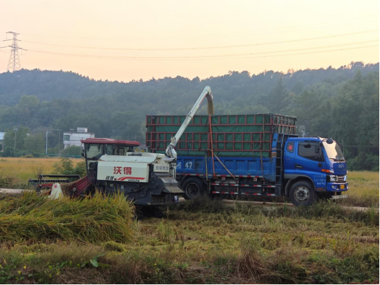 田野里兩臺收割機正開足馬力“馳騁”,伴隨著陣陣轟鳴,沉甸甸的稻穗被快速收割、脫粒,金黃的稻谷源源不斷涌入糧箱。當收割機糧箱即將滿倉時,駕駛員緩緩將機器駛向等候的貨車。隨著卸糧筒緩緩伸出,金黃的稻谷如瀑布般傾瀉而下,落入貨車車廂,一幅“機器搶收、車輛快運”的豐收圖景在秋日里格外熱鬧。田邊,幾位村民正幫著清理散落的稻谷,臉上滿是欣慰。他們紛紛表示“以前收稻子,全家上陣彎腰割、手工打,累得直不起腰,現在看著機器跑一圈就完活,貨車直接拉走,我們輕松多了!”